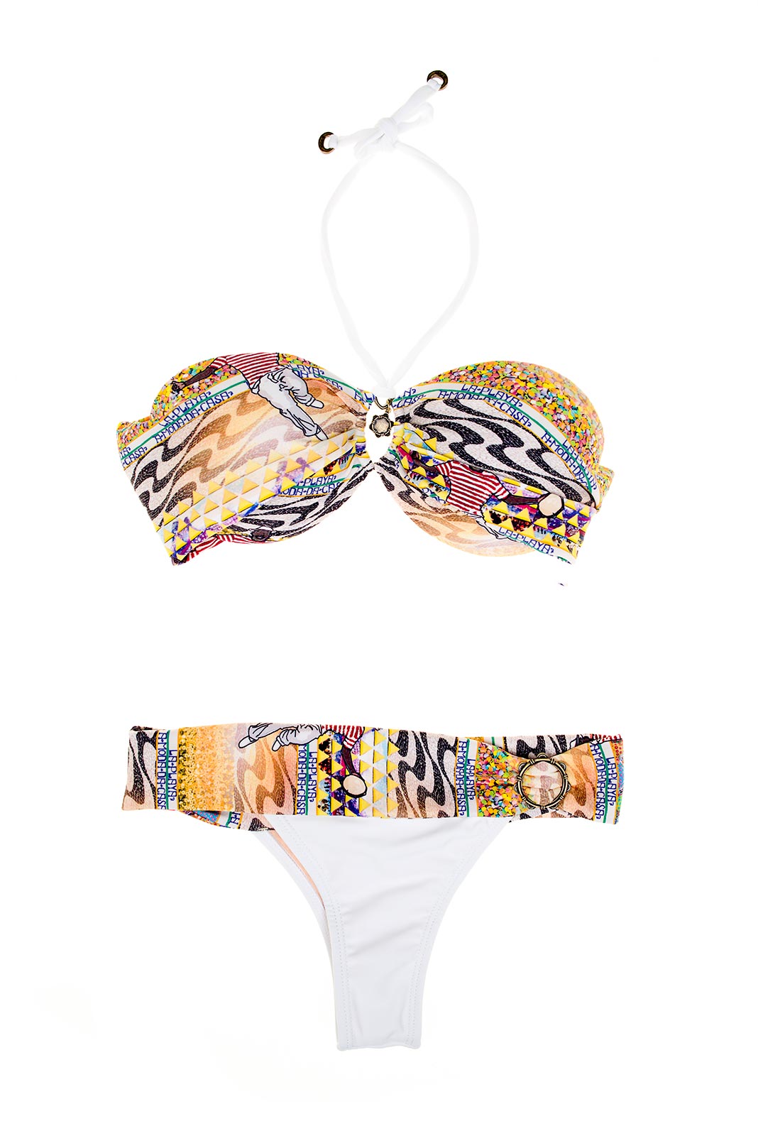 Lindo como nós gostamos, o "Moda da Casa" surpreende a cada detalhe que encontramos. Composto por tomara-que-caia de bojo firme com estampa alusiva ao Brasil e calcinha básica com cós largo também com a mesma estampa, tem uns lindos detalhes metálicos nas duas peças. É um modelo confortável com amarração nas costas e pescoço. Feito pela La Playa pensando em você!